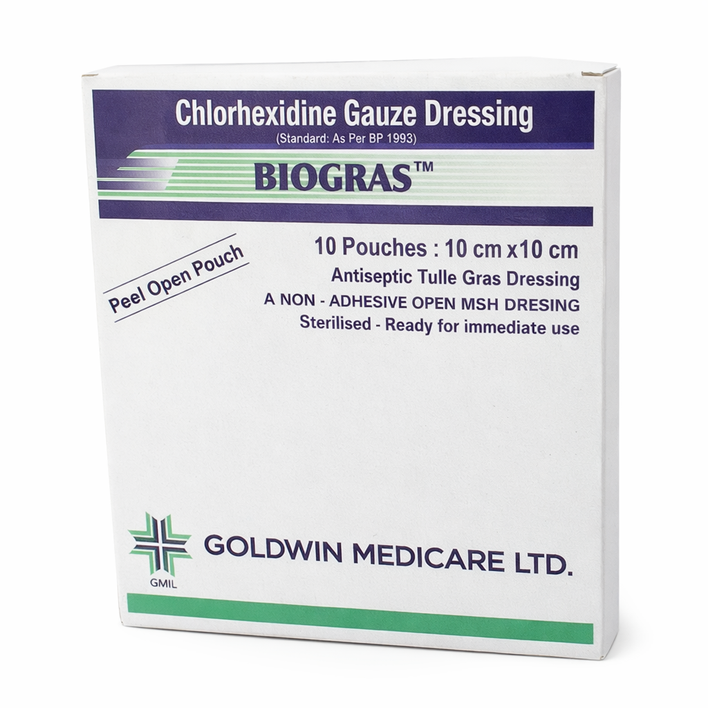 BIOGRAS Chlorhexidine Gauze Dressing 10cm × 10cm (10’s) is a sterile, non-adhesive antiseptic tulle gras dressing designed for wound care and infection prevention. Each pouch contains a ready-to-use mesh dressing impregnated with chlorhexidine, providing effective antibacterial protection while allowing the wound to breathe. Ideal for burns, cuts, and surgical wounds.