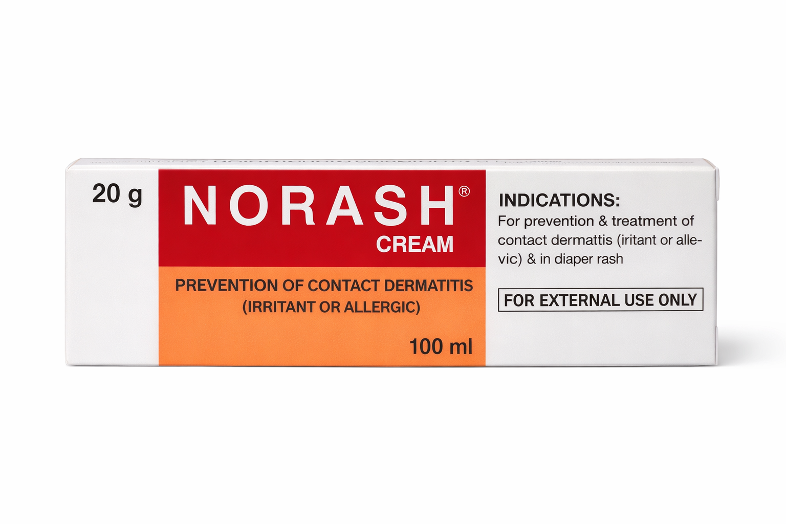 Norash® Cream (20 g) is a clinically formulated topical solution designed for the prevention and treatment of contact dermatitis — whether irritant or allergic — and for soothing diaper rash in infants. Its gentle yet effective formula creates a protective barrier on the skin, reducing irritation and helping restore comfort.