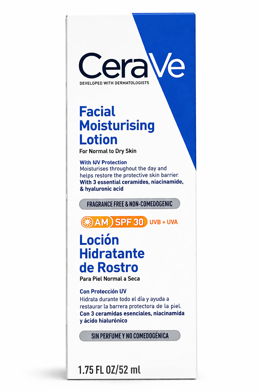 Start your day with CERAVE AM Facial Moisturising Lotion SPF30, a dermatologist-developed lotion that moisturizes and shields your skin from harmful UVA and UVB rays. Infused with 3 essential ceramides, niacinamide, and hyaluronic acid, it helps strengthen the skin barrier, reduce irritation, and maintain hydration for all-day comfort. Ideal for normal to dry skin, this fragrance-free, non-comedogenic formula ensures healthier, protected skin with every application.