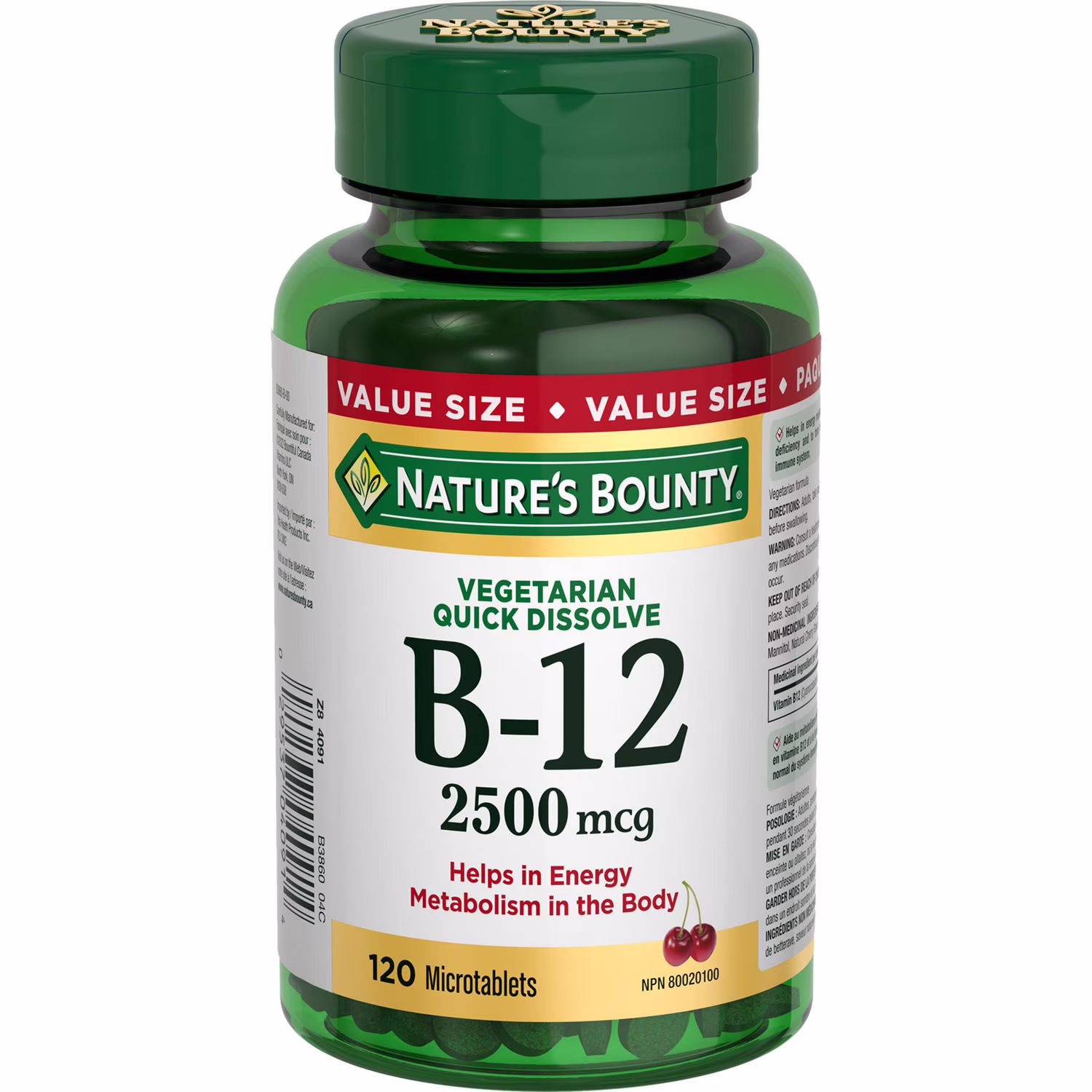 Nature’s Bounty B12 1000mcg Quick Dissolve Tablets provide 500 mcg of methylcobalamin, the active form of vitamin B12, supporting energy metabolism, heart, and nervous system health. These tablets dissolve quickly under the tongue, offering fast absorption and come in a natural cherry flavor